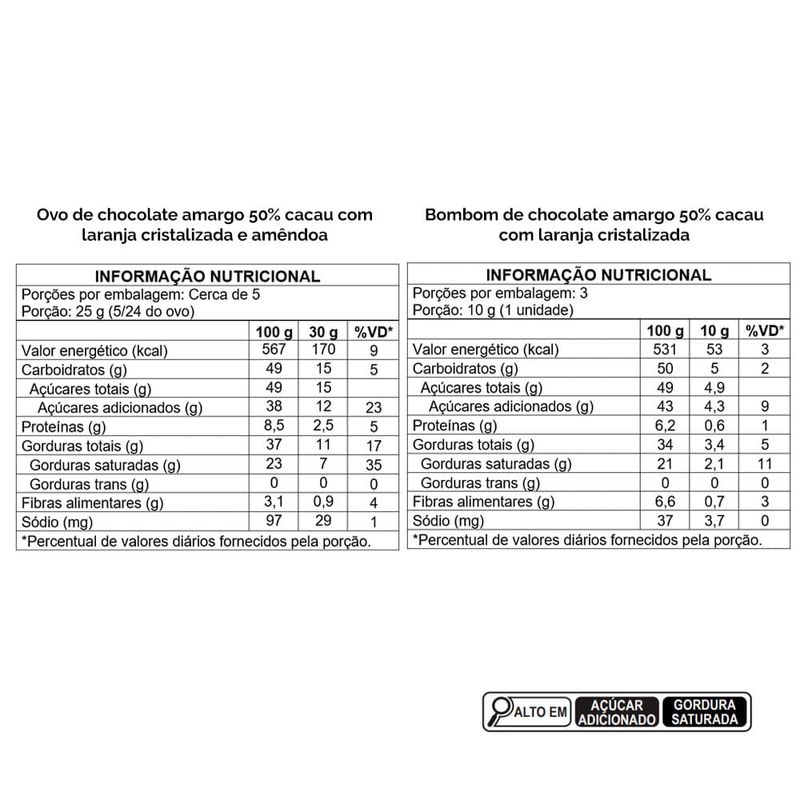 Ingredientes: açúcar, pasta de cacau, manteiga de cacau, leite em pó integral, amêndoa, laranja cristalizada em tiras, emulsificante lecitina de soja e aromatizante. ALÉRGICOS: CONTÉM AMÊNDOA E DERIVADOS DE LEITE E SOJA. PODE CONTER AMENDOIM, AVELÃS, CASTANHA-DE-CAJU, CASTANHA-DO-BRASIL, MACADÂMIAS, NOZES E PISTACHES. CONTÉM LACTOSE. NÃO CONTÉM GLÚTEN.