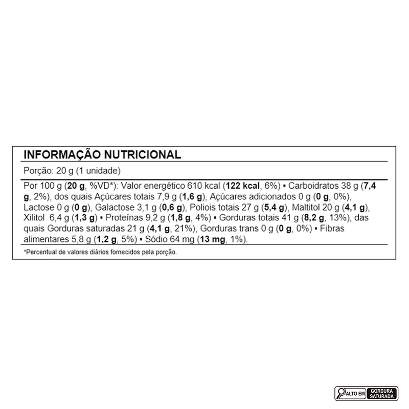 Ingredientes: manteiga de cacau, leite em pó integral instantâneo para dietas com restrição de lactose (leite integral, enzima lactase, vitaminas A, C, D e emulsificante lecitina de soja), pasta de cacau, cacau em pó, avelã, óleo de girassol, gordura vegetal, edulcorantes naturais: maltitol e xilitol e emulsificante lecitina de soja. ALÉRGICOS: CONTÉM AVELÃS E DERIVADOS DE LEITE E SOJA. PODE CONTER AMENDOIM, AMÊNDOA, CASTANHA-DE-CAJU, CASTANHA-DO-BRASIL, MACADÂMIA, NOZES E PISTACHE. NÃO CONTÉM GLÚTEN.