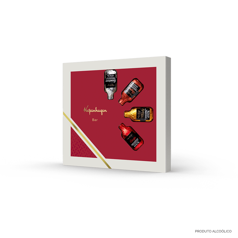Garrafinha de chocolate ao leite recheada com whisky Garrafinha de chocolate ao leite recheada com licor Cointreau Garrafinha de chocolate ao leite recheada com licor de cereja Garrafinha de chocolate ao leite recheada com licor sabor conhaque. Produto Alcoólico. Não recomendado para menores de 18 anos.