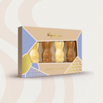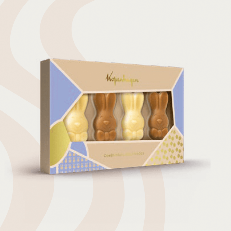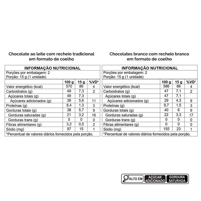Contém: 2 chocolates ao leite com recheio tradicional em formato de coelho e 2 chocolates branco com recheio branco em formato de coelho.