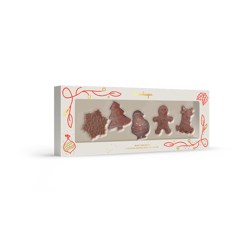 Chocolates ao leite nos formatos de rena, boneco de neve, Papai Noel, Árvore de Natal e Flocos de Neve.