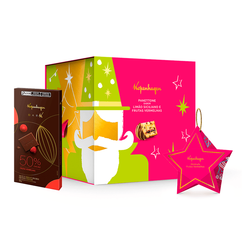 Contém: 1 Panettone Recheado Limão e Frutas Vermelhas 660G, 1 Enfeite Estrela Minitrufas Frutas Vermelhas 48G e 1 Tablete Amargo Frutas Vermelhas 100G.