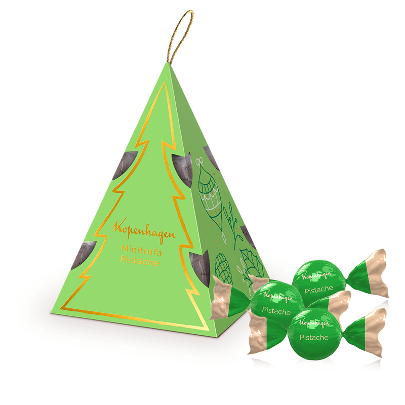 Contém: 1 Panettone Recheado Doce de Leite e Pistache 640G, 1 Petittone Pistache Chocolate Branco 180G e 1 Enfeite Árvore Minitrufas Pistache 48G.