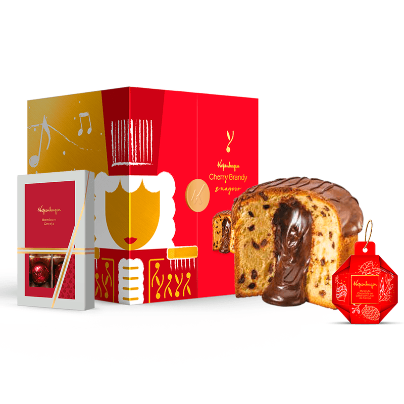 Contém: 1 Panettone Exagero Cherry Brandy 1.340KG, 1 Enfeite Estrela Minitrufas Frutas Vermelhas 48G e 1 Bombons Cereja 150G.