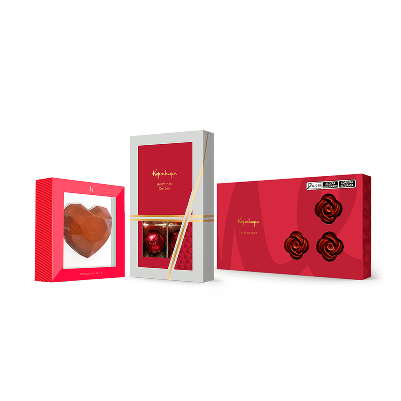 Contém: 1 Coração ao Leite, 1 Caixa Rosas ao Leite e 1 Caixa Bombons Cereja