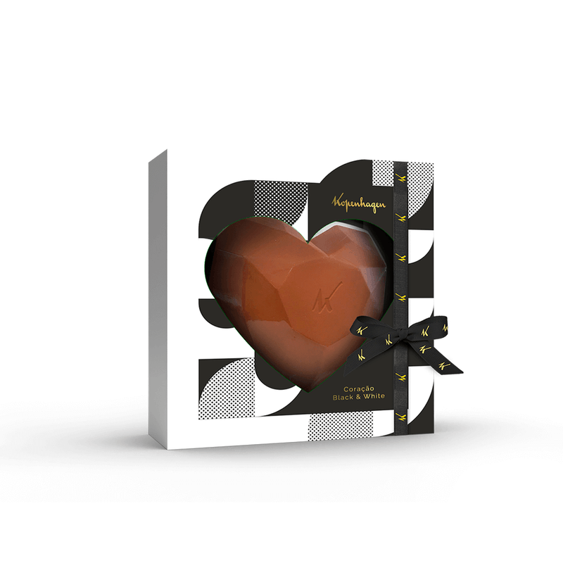 Entre tantas ideias de presente para o Dia das Mães, o nosso coração Black & White não pode ficar de fora! Feito com um delicioso chocolate Kopenhagen, ele possui um formato facetado moderno e elegante, lapidado como um diamante. Além disso, conta com uma caixa delicada, com frente transparente, que guarda com carinho o coração de chocolate. Duas partes formando um só coração para celebrar o amor.