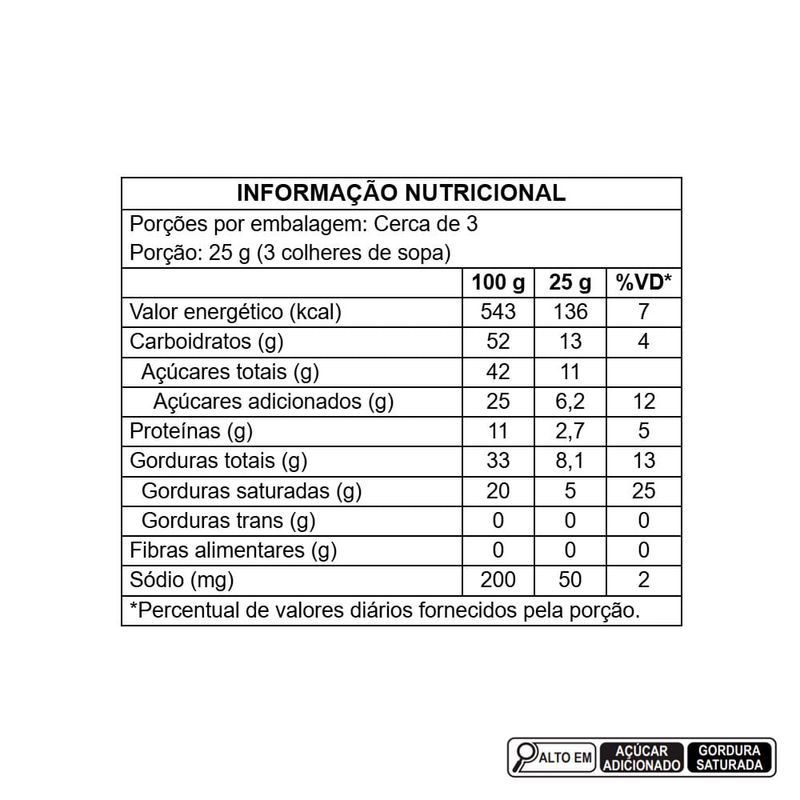 leite em pó integral, manteiga de cacau, açúcar, gotas de biscoito sabor chocolate (farinha de trigo enriquecida com ferro e ácido fólico, açúcar, gordura vegetal, cacau em pó, sal, emulsificante lecitina de soja, fermentos químicos: difosfato dissódico e bicarbonato de sódio e corante caramelo IV), soro de leite em pó parcialmente desmineralizado, água, antiumectante talco, espessante goma arábica, aromatizante e emulsificante lecitina de soja. ALÉRGICOS: CONTÉM DERIVADOS DE LEITE, SOJA E TRIGO. PODE CONTER AMENDOIM, AMÊNDOA, AVEIA, AVELÃS, CASTANHA-DE-CAJU, CASTANHA-DO-BRASIL, CENTEIO, CEVADA, LEITE, MACADÂMIAS, NOZES E PISTACHES. CONTÉM LACTOSE. CONTÉM GLÚTEN.