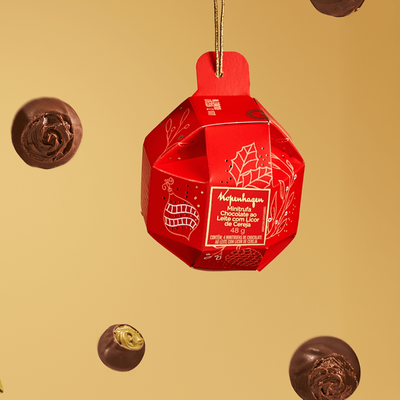 Um presente encantador! Enfeite em formato de bola com Minitrufas de chocolate ao leite com licor de cereja, super cremosas.