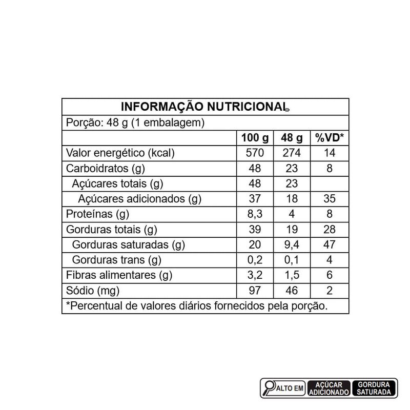 açúcar, leite em pó integral, pasta de cacau, gordura vegetal, manteiga de cacau, creme de leite em pó, licor de cereja, rum, emulsificantes: lecitina de soja, poliglicerol polirricinoleato e triestearato de sorbitana, aromatizantes e conservador sorbato de potássio. ALÉRGICOS: CONTÉM DERIVADOS DE LEITE E SOJA. PODE CONTER AMENDOIM, AMÊNDOA, AVELÃS, CASTANHA-DE-CAJU, CASTANHA-DO-BRASIL, MACADÂMIAS, NOZES E PISTACHES. CONTÉM LACTOSE. NÃO CONTÉM GLÚTEN.
