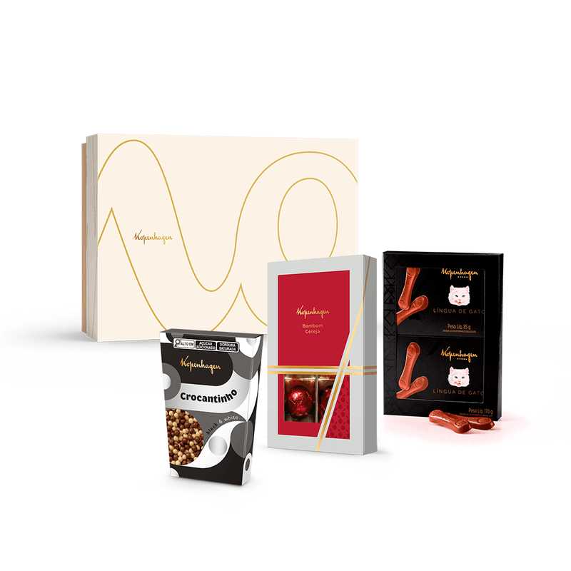 Contém: 1 Bombons Cereja 150G, 1 Língua de Gato Duas Unidades 170G, 1 Crocantinho Black & White 80G e 1 Caixa Tamanho M (8cm x 22cm x 26cm).