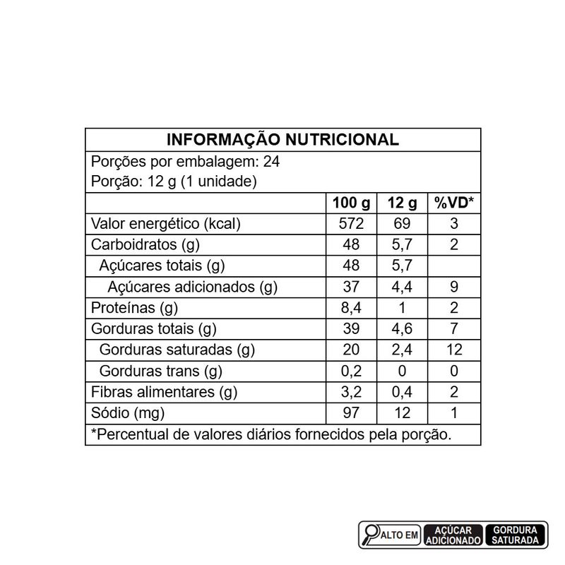 açúcar, leite em pó integral, pasta de cacau, gordura vegetal, manteiga de cacau, creme de leite em pó, emulsificantes: lecitina de soja, triestearato de sorbitana e poliglicerol polirricinoleato e aromatizantes. ALÉRGICOS: CONTÉM DERIVADOS DE LEITE E SOJA. PODE CONTER AMENDOIM, AMÊNDOA, AVELÃS, CASTANHA-DE-CAJU, CASTANHA-DO-BRASIL, MACADÂMIAS, NOZES E PISTACHES. CONTÉM LACTOSE. NÃO CONTÉM GLÚTEN.