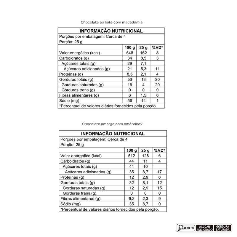 Ingredientes: macadâmia, açúcar, leite em pó integral, manteiga de cacau, pasta de cacau, água, antiumectante silicato de magnésio, espessante goma arábica, emulsificante lecitina de soja e aromatizante. ALÉRGICOS: CONTÉM MACADÂMIA E DERIVADOS DE LEITE E SOJA. PODE CONTER AMENDOIM, AMÊNDOAS, AVELÃ, CASTANHA-DE-CAJU, CASTANHA-DO-BRASIL, NOZES E PISTACHE. CONTÉM LACTOSE. NÃO CONTÉM GLÚTEN.