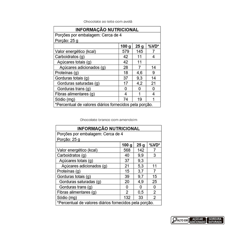 Ingredientes: avelã, açúcar, leite em pó integral, manteiga de cacau, pasta de cacau, água, antiumectante silicato de magnésio, espessante goma arábica, emulsificante lecitina de soja e aromatizante. ALÉRGICOS: CONTÉM AVELÃ E DERIVADOS DE LEITE E SOJA. PODE CONTER AMENDOIM, AMÊNDOAS, CASTANHA-DE-CAJU, CASTANHA-DO-BRASIL, MACADÂMIA, NOZES E PISTACHE. CONTÉM LACTOSE. NÃO CONTÉM GLÚTEN.
