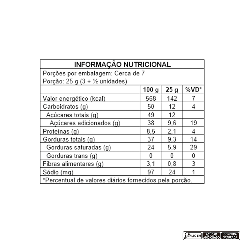 Ingredientes: açúcar, leite em pó integral, manteiga de cacau, pasta de cacau, emulsificante lecitina de soja e aromatizante. ALÉRGICOS: CONTÉM DERIVADOS DE LEITE E SOJA. PODE CONTER AMENDOIM, AMÊNDOAS, AVELÃ, CASTANHA-DE-CAJU, CASTANHA-DO-BRASIL, MACADÂMIA, NOZES E PISTACHE. CONTÉM LACTOSE. NÃO CONTÉM GLÚTEN.