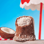 Wafer com marshmallow sabor mousse de coco, coberto com chocolate ao leite e decorado com coco ralado.