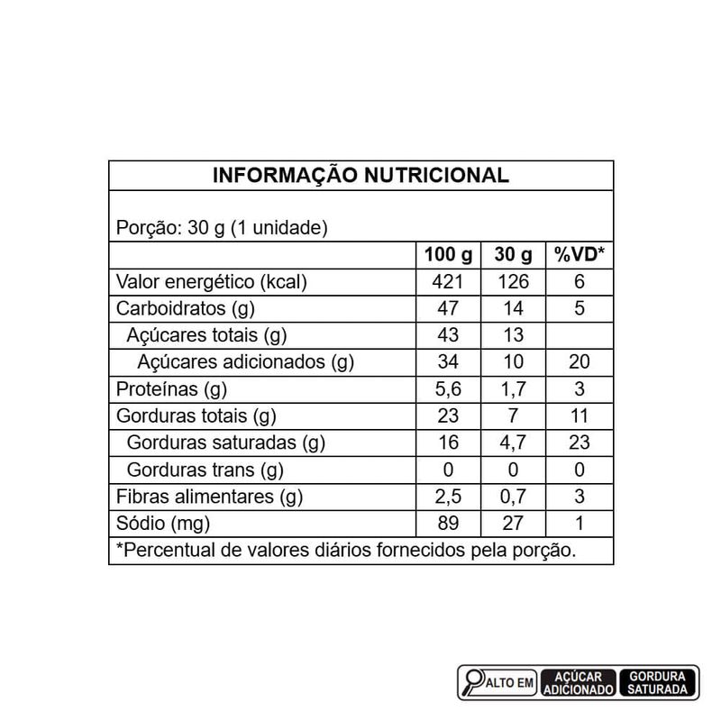 açúcar, água, leite em pó integral, manteiga de cacau, Coco Ralado, pasta de cacau, xarope de glicose, clara de ovos, farinha de trigo enriquecida com ferro e ácido fólico, gema de ovos, óleo vegetal de soja, sal, emulsificante lecitina de soja, aromatizantes, estabilizante carragena, acidulante ácido cítrico e fermento químico bicarbonato de sódio. ALÉRGICOS: CONTÉM DERIVADOS DE LEITE, TRIGO, OVOS E SOJA. PODE CONTER AMENDOIM, AMÊNDOA, AVEIA, AVELÃS, CASTANHA-DE-CAJU, CASTANHA-DO-BRASIL, CENTEIO, CEVADA, MACADÂMIAS, NOZES E PISTACHES. CONTÉM LACTOSE. CONTÉM GLÚTEN.