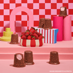 Contém: 3 Wafers com marshmallow sabor frutas vermelhas, cobertos com chocolate ao leite e decorados com confeito de açúcar.
