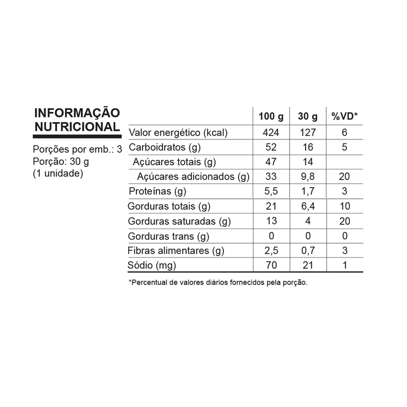Ingredientes: açúcar, água, leite em pó integral, manteiga de cacau, pasta de cacau, confeito de açúcar (açúcar, dextrina, fécula de mandioca, glaceantes: cera de abelha e talco e corante artificial vermelho 40), xarope de glicose, morango liofilizado em flocos, framboesa liofilizada granulada, clara de ovos, farinha de trigo enriquecida com ferro e ácido fólico, óleo de soja, gema de ovos, sal, emulsificante lecitina de soja, aromatizantes, acidulante ácido cítrico, estabilizante carragena e fermento químico bicarbonato de sódio. ALÉRGICOS: CONTÉM DERIVADOS DE LEITE, TRIGO, OVOS E SOJA. PODE CONTER AMENDOIM, AMÊNDOAS, AVEIA, AVELÃS, CASTANHA-DE-CAJU, CASTANHA-DO-BRASIL, CENTEIO, CEVADA, MACADÂMIA, NOZES E PISTACHE. CONTÉM LACTOSE. CONTÉM GLÚTEN.