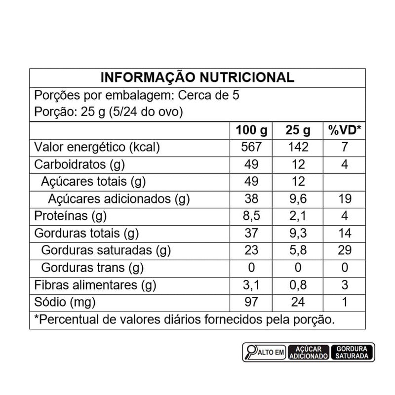açúcar, leite em pó integral, manteiga de cacau, pasta de cacau, emulsificante lecitina de soja e aromatizante. ALÉRGICOS: CONTÉM DERIVADOS DE LEITE E SOJA. PODE CONTER AMENDOIM, AMÊNDOA, AVEIA, AVELÃS, CASTANHAS, CASTANHA-DE-CAJU, CASTANHA-DO-BRASIL, CENTEIO, CEVADA, MACADÂMIAS, NOZES, OVOS, PECÃS, PINOLI, PISTACHES E TRIGO. CONTÉM LACTOSE. CONTÉM GLÚTEN.