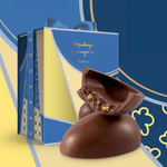 Ovo de chocolate ao leite com recheio sabor chocolate com pipoca caramelizada.