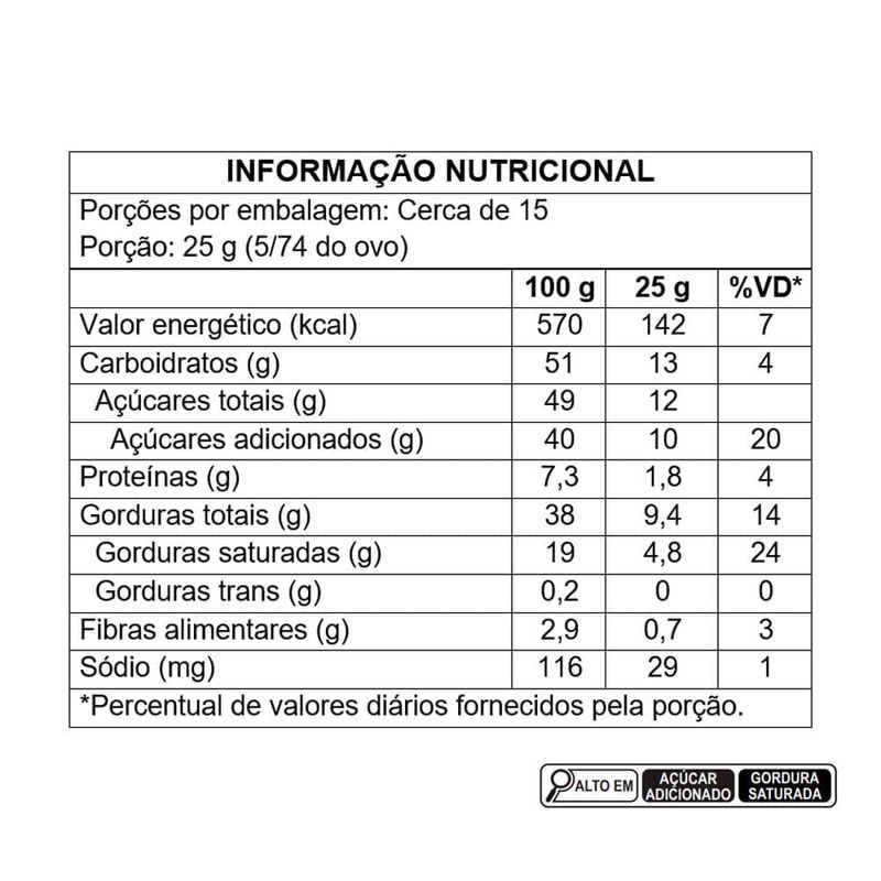 recheio sabor chocolate com pipoca caramelizada (açúcar, óleo vegetal de soja, leite em pó integral, pipoca caramelizada (milho, açúcar, glucose de milho, óleo vegetal de soja, antiumectante bicarbonato de sódio e emulsificante lecitina), gordura vegetal, cacau em pó, sal, emulsificantes: lecitina e mono e diglicerídeos de ácidos graxos, aromatizante e antioxidante BHA), açúcar, leite em pó integral, manteiga de cacau, pasta de cacau, emulsificante lecitina de soja e aromatizantes. ALÉRGICOS: CONTÉM DERIVADOS DE LEITE E SOJA. PODE CONTER AMENDOIM, AMÊNDOA, AVEIA, AVELÃS, CASTANHAS, CASTANHA-DE-CAJU, CASTANHA-DO-BRASIL, CENTEIO, CEVADA, MACADÂMIAS, NOZES, OVOS, PECÃS, PINOLI, PISTACHES E TRIGO. CONTÉM LACTOSE. CONTÉM GLÚTEN.