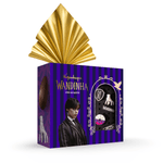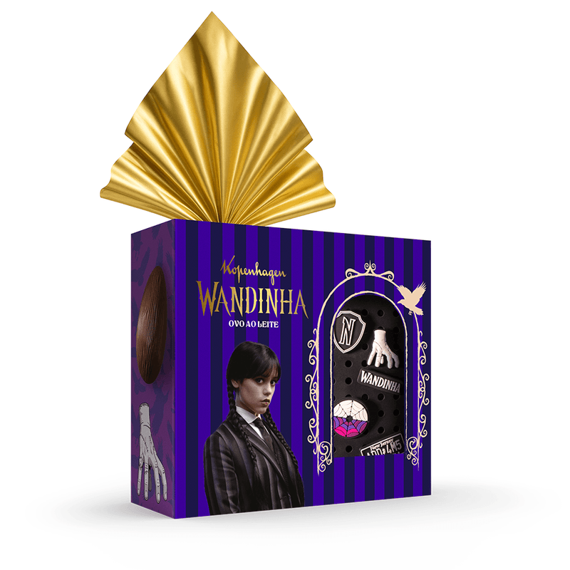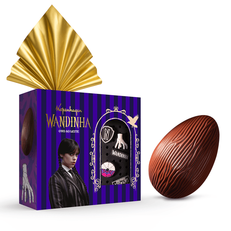 CONTÉM: 1 Ovo de chocolate ao leite e 1 Bolsa com pins Wandinha.