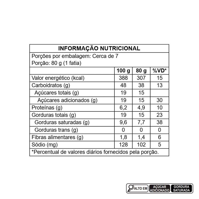 farinha de trigo enriquecida com ferro e ácido fólico, gotas de chocolate ao leite, açúcar, gordura vegetal, ovo integral pasteurizado, gema de ovo pasteurizada, manteiga sem sal, açúcar invertido, glúten de trigo, leite em pó integral, sal, extrato de malte de cevada, emulsificantes: mono e diglicerídeos de ácidos graxos e lecitina de soja, umectante glicerol, aromatizantes, conservadores: ácido sórbico e propionato de cálcio e corante beta-caroteno sintético. ALÉRGICOS: CONTÉM OVOS E DERIVADOS DE TRIGO, LEITE, SOJA, CEVADA E OVOS. PODE CONTER AVEIA, AMENDOIM, AMÊNDOA, AVELÃS, CASTANHA-DE-CAJU, CASTANHA-DO-BRASIL, NOZES, CENTEIO, PISTACHES, MACADÂMIAS E PECÃS. CONTÉM LACTOSE. CONTÉM GLÚTEN.