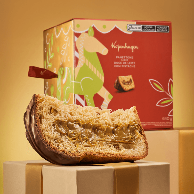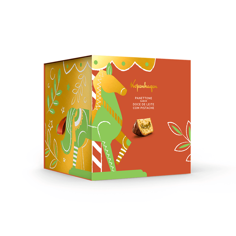 Um toque de elegância e sabor! Panettone Massa branca com pedaços de pistache, recheio cremoso sabor doce de leite com pistache e uma cobertura de chocolate ao leite e decorado com riscas de chocolate amargo. Uma combinação única que transforma cada fatia em um momento especial do seu Natal.