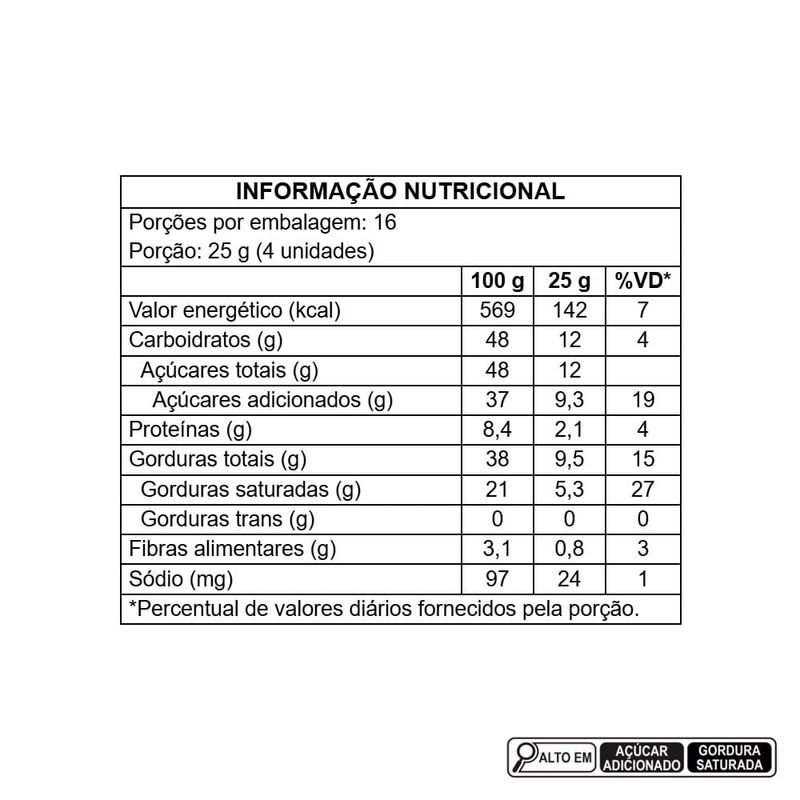 açúcar, leite em pó integral, manteiga de cacau, pasta de cacau, gordura vegetal, creme de leite em pó, licor de cereja, rum, emulsificantes: lecitina de soja, poliglicerol polirricinoleato e triestearato de sorbitana, aromatizantes e conservador sorbato de potássio. ALÉRGICOS: CONTÉM DERIVADOS DE LEITE E SOJA. PODE CONTER AMENDOIM, AMÊNDOA, AVELÃS, CASTANHA-DE-CAJU, CASTANHA-DO-BRASIL, MACADÂMIAS, NOZES E PISTACHES. CONTÉM LACTOSE. NÃO CONTÉM GLÚTEN.
