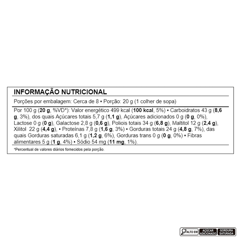Ingredientes: gordura vegetal, cacau em pó, óleo de girassol, leite em pó integral instantâneo para dietas com restrição de lactose (leite integral, enzima lactase, vitaminas A, C, D e emulsificante lecitina de soja), edulcorantes naturais: xilitol e maltitol e emulsificante lecitina de soja. ALÉRGICOS: CONTÉM DERIVADOS DE LEITE E SOJA. PODE CONTER AMENDOIM, AMÊNDOAS, AVELÃ, CASTANHA-DE-CAJU, CASTANHA-DO-BRASIL, MACADÂMIA, NOZES E PISTACHE. NÃO CONTÉM GLÚTEN.