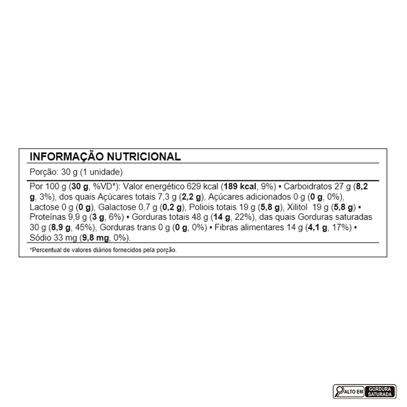 Ingredientes: pasta de cacau, manteiga de cacau, amêndoas de cacau torradas (nibs de cacau), leite em pó integral instantâneo para dietas com restrição de lactose (leite integral, enzima lactase, vitaminas A, C, D e emulsificante lecitina de soja), edulcorante natural xilitol e emulsificante lecitina de soja. ALÉRGICOS: CONTÉM DERIVADOS DE LEITE E SOJA. PODE CONTER AMENDOIM, AMÊNDOAS, AVELÃS, CASTANHA-DE-CAJU, CASTANHA-DO-BRASIL, MACADÂMIA, NOZES E PISTACHE. NÃO CONTÉM GLÚTEN.