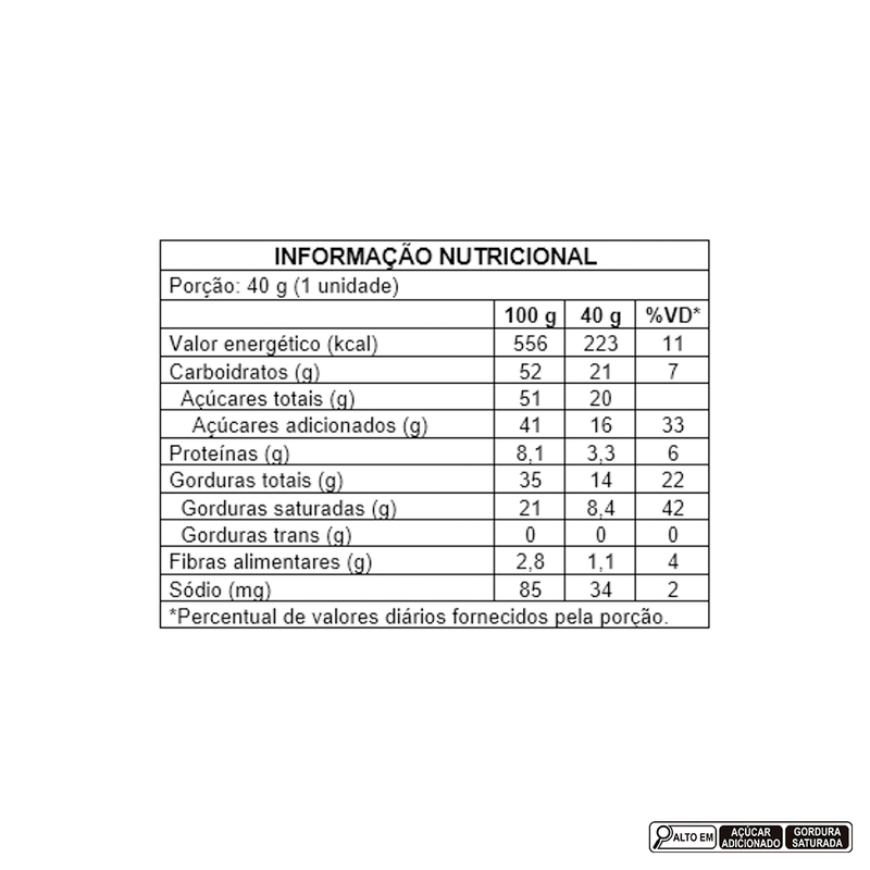 Ingredientes: açúcar, leite em pó integral, manteiga de cacau, crocante de castanha-de-caju (açúcar, castanha-de-caju, glicose, gordura de palma, óleo mineral e glaceante talco), pasta de cacau, emulsificante lecitina de soja e aromatizante. ALÉRGICOS: CONTÉM CASTANHA-DE-CAJU E DERIVADOS DE LEITE E SOJA. PODE CONTER AMENDOIM, AMÊNDOA, AVELÃ, CASTANHA-DO-BRASIL, MACADÂMIA, NOZES E PISTACHE. CONTÉM LACTOSE. NÃO CONTÉM GLÚTEN.